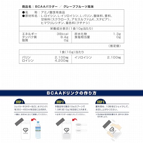 グロング BCAAは筋肉の主要な構成要素である必須アミノ酸、特にバリン・ロイシン・イソロイシンを「1:2:1」という黄金比で配合しています。
