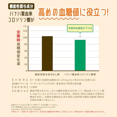 本品はバナバ葉由来のコロソリン酸を配合し、血糖値を下げる機能が報告されていますが、特定保健用食品(トクホ)ではなく、消費者庁長官の個別審査を経ていないため、効果には個人差があります。