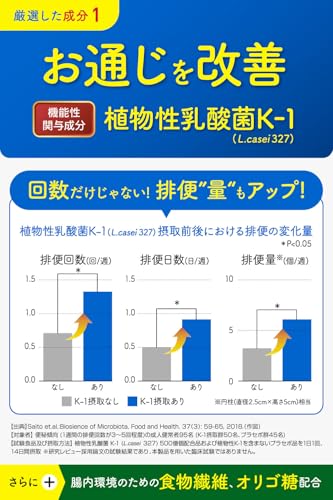 植物性乳酸菌K-1(L.casei 327)は、善玉菌の働きをサポートし、おなかの調子を整えて便通を改善することが科学的に報告されています。