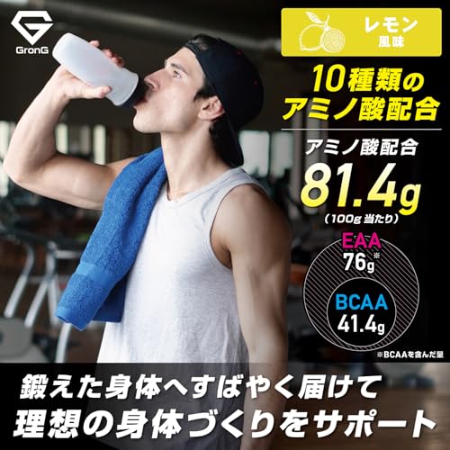 グロングのEAAは、必須アミノ酸8種に加えて非必須アミノ酸2種も含んでおり、バランスよく体に届けられる点が特徴です。