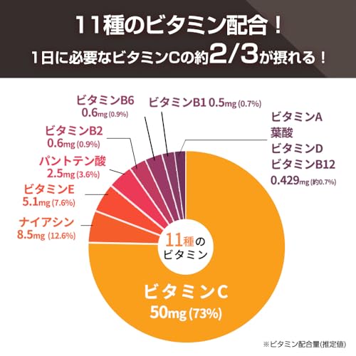 このプロテインにはビタミン11種を配合し、特にビタミンCは1杯で約50mg摂取可能です。