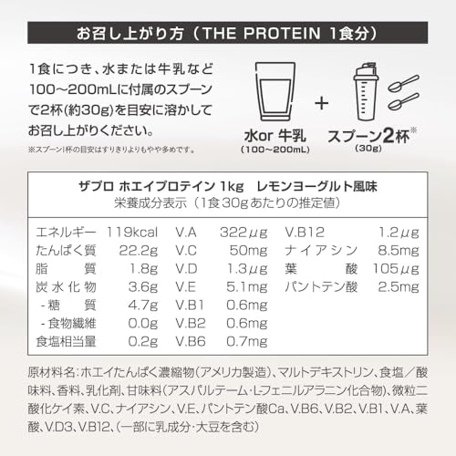 ザプロ プロテイン 1kg レモンヨーグルト 風味 ホエイプロテイン ビタミン 11種 国内製造 低糖質 低脂質 高タンパク 筋トレ WPC ぷろていん 武内製薬 THE PROTEIN 最後 画像