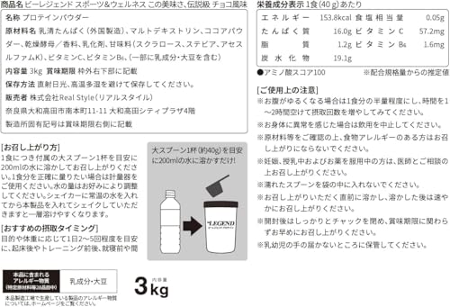 ビーレジェンド beLEGEND プロテイン 3kg チョコ風味は、マルチプロテインとマルトデキストリン配合によるエネルギー補給が特徴です。