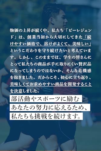 従来のビーレジェンド製品が持つ「安くて、美味しくて、溶けやすい」という特徴はそのままに、スポーツ現場で求められるエネルギー補給にも注力した点が大きな違いです。