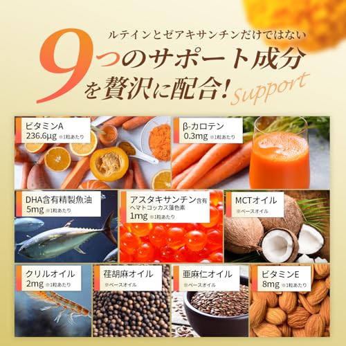 ルテインとゼアキサンチンだけでなく、目の疲れや乾燥を緩和するための9種類のサポート成分を配合。