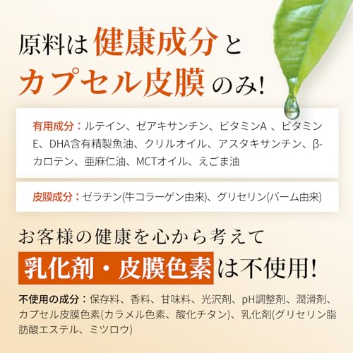 本製品はマリーゴールド由来の天然ルテインを100%使用し、国産魚油とクリルオイルも配合しています。