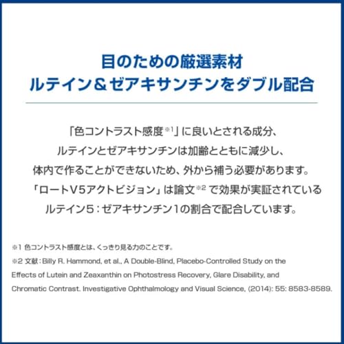 ロートV5は、ルテインとゼアキサンチンを機能性関与成分として配合しており、これらは科学的に視力の維持に役立つことが示唆されています。
