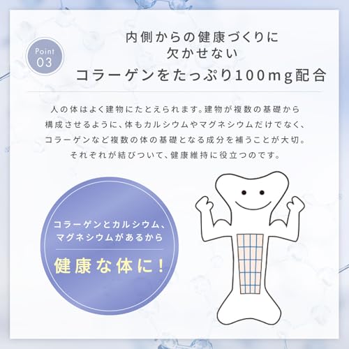 本製品にはカルシウム300mg、マグネシウム150mg、さらにコラーゲン100mgをバランスよく配合。