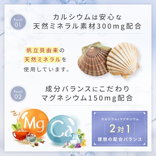 カルシウムとマグネシウムの理想的な比率である2対1を実現し、食事だけでは不足しがちなこれらのミネラルを効果的に補います。