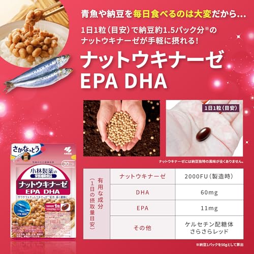 小林製薬の「さかなっとう 納豆キナーゼEPA・DHAサプリ」は、納豆菌が生み出す酵素であるナットウキナーゼと、青魚由来のオメガ3脂肪酸であるEPA・DHAを一つにまとめた栄養補助食品です。