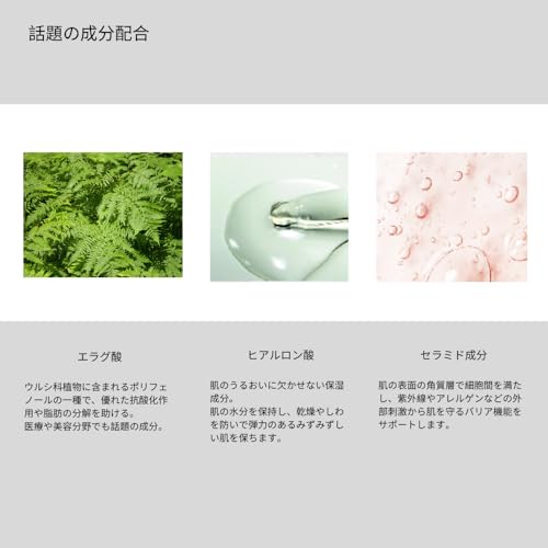 エラグ酸、ヒアルロン酸、セラミドという成分が配合されており、これらは公的研究でも肌の保湿や抗酸化、バリア機能のサポートが示されています。