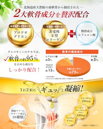 本サプリメントは、軟骨成分として知られるグルコサミンのほか、加齢で減少しやすいプロテオグリカンと非変性Ⅱ型コラーゲンを贅沢に配合しています。
