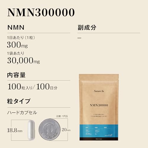 Nature In NMNサプリメントは、1粒に300mgの高濃度NMNを配合した日本製のサプリメントで、1袋に100粒入りの大容量セット(3袋セットで計300粒、約300日分)を特徴としています。