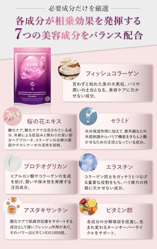 一般的なプラセンタサプリメントは単一成分に注力することが多いですが、PUREHADAはプラセンタを中心に、ヒアルロン酸、プロテオグリカン、コラーゲン、エラスチン、ビタミンB群、アスタキサンチン、セラミド、桜の花エキスなど厳選した9種の成分を配合。