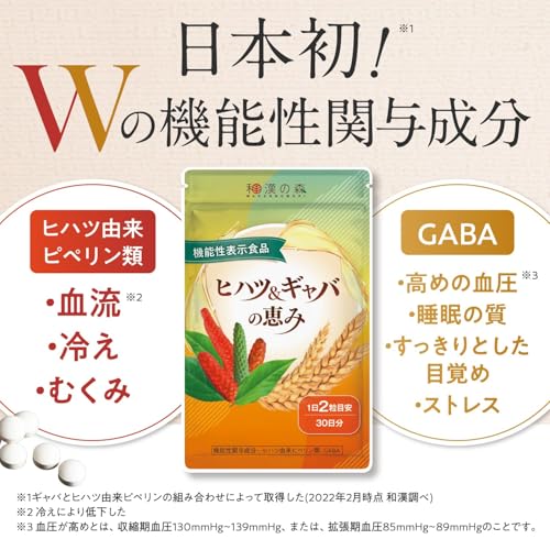 本製品「ヒハツ&ギャバの恵み 血圧 むくみ 60粒」は機能性表示食品として、ヒハツ由来ピペリン類やGABAをバランス良く配合しています。