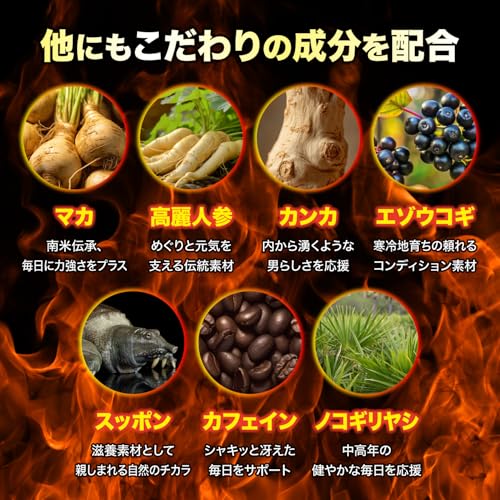 忙しい現代人の生活リズムをサポートするため、マカや高麗人参末、すっぽん、ノコギリヤシなど、厳選された成分がバランスよく含まれています。