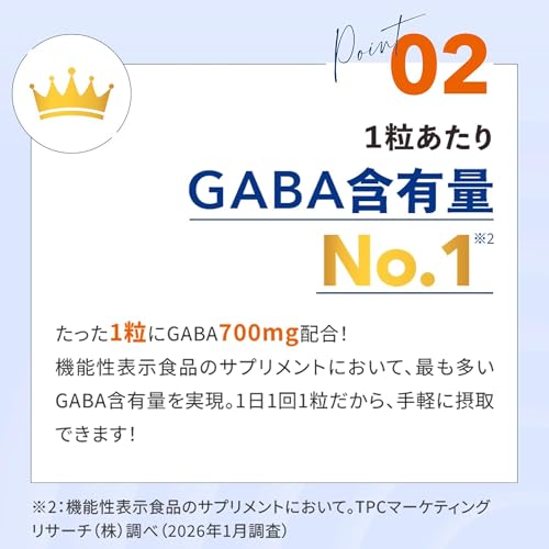 機能性表示食品としてGABA(γ-アミノ酪酸)を1粒あたり700mg配合し、科学的にも睡眠の質改善に寄与するエビデンスが報告されています。